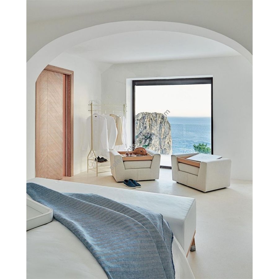It is not an armchair, but it is as comfortable as an armchair. Paolino pouf well interprets the combination of genius and intemperance. Very soft in the lines of its upper part, it lets some corners emerge in the base.The shapes coexist: round, oblique, or more squared, diverse but in harmony. It is born from summer and island inspirations.