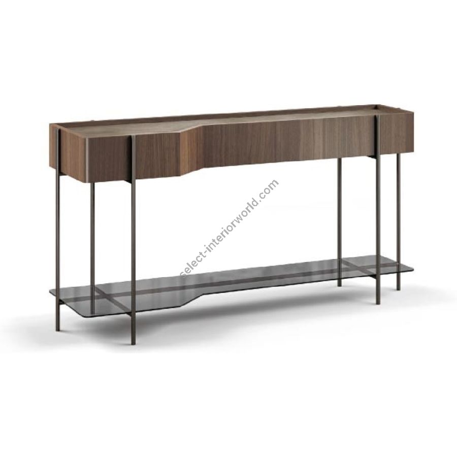 Console in black walnut veneered poplar plywood. Painted metal structure. Top in MDF coated poplar plywood with lacquered finish. Lower shelf in smoked glass.