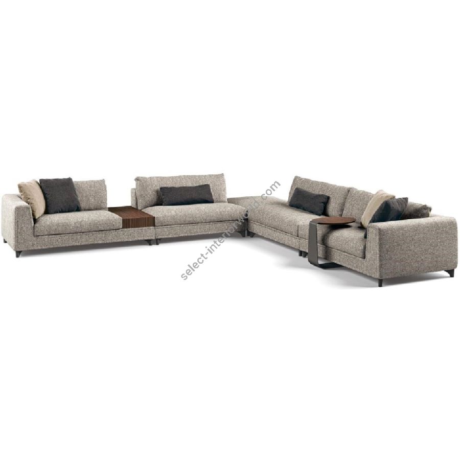 Modular sofa with internal structure in solid beech wood and pop- lar plywood. Seat sprung system with twisted elastic webbing belts. Padding in differentiated-density polyurethane foam, covers not re- movable. Seat cushions padded with polyurethane foam and goose down, removable covers. Back cushions padded with silicone wad- ding and goose down, removable covers. Smocked eucalypthus ve- neered poplar plywood integrated table. Painted metal feet. All the upholstered elements are available in leather or fabric. Decorative cushions padded with silicone wadding and goose down, removable covers.