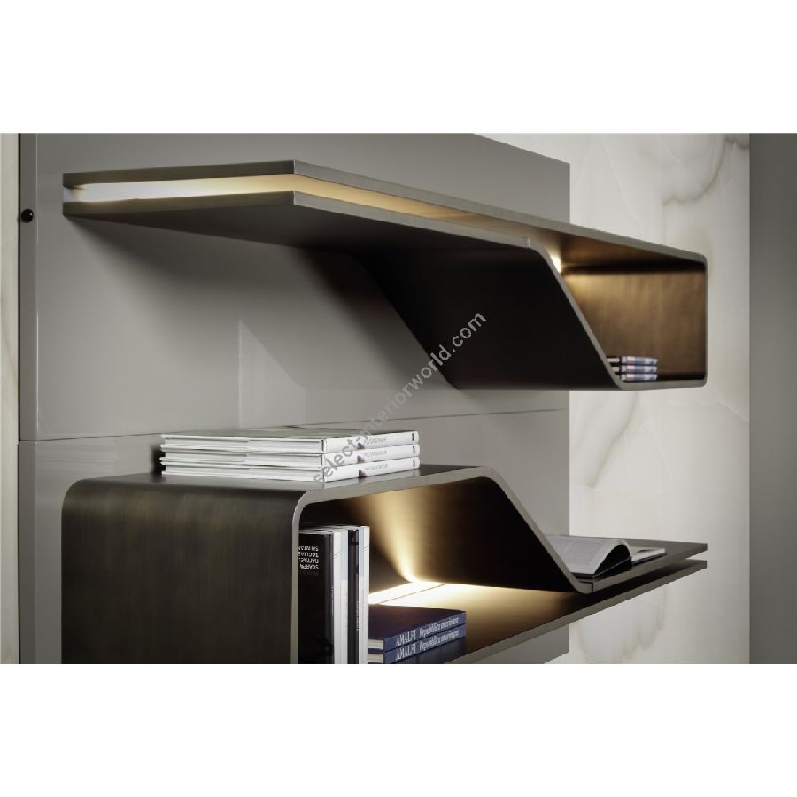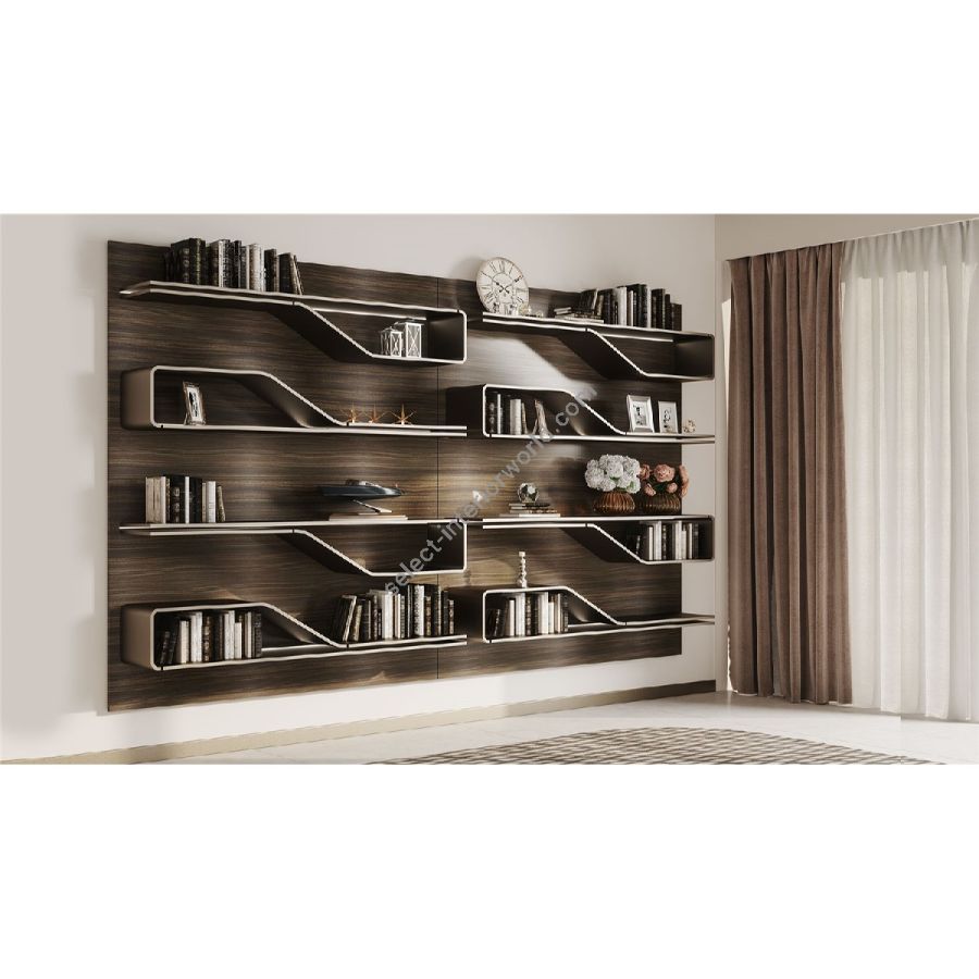 Interlocking modular bookcase in matt lacquered wood or in Henné oakwood or in the combination of shiny ebony with shelves in satin brass finish. LED lighting system. Can be used to build-up bookcases in various sizes, hanging or floor-standing and can be connected to Movie Tv mirror.