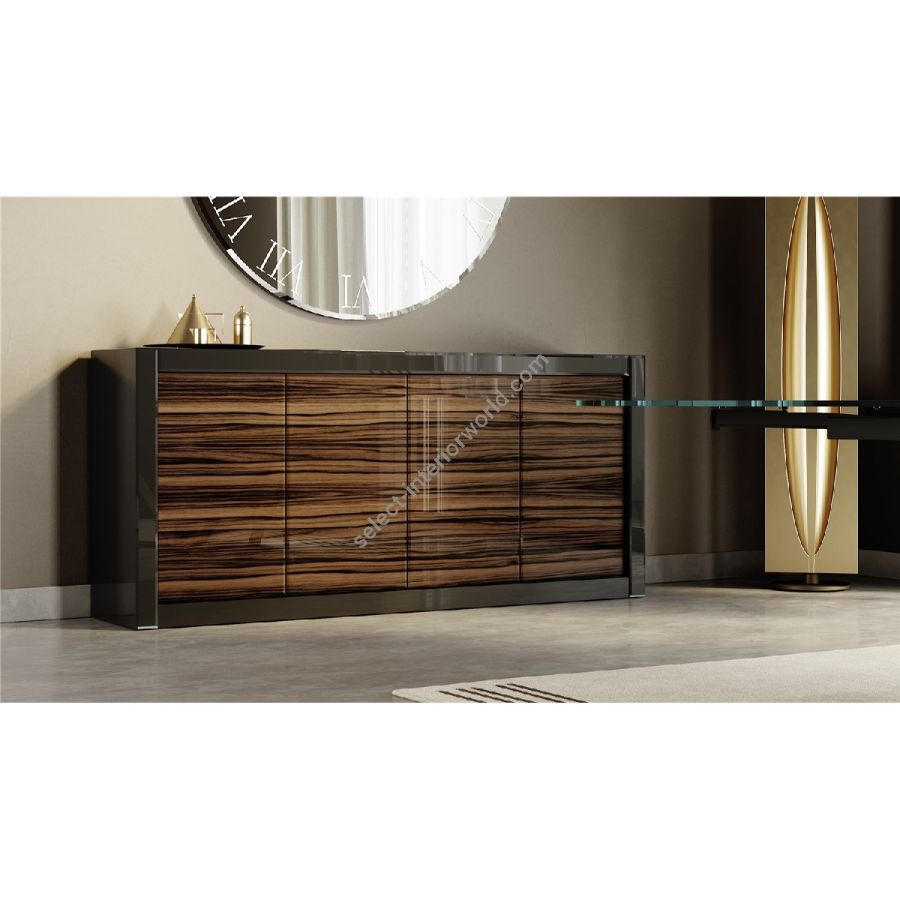 Sideboard with LED lighting under the top. Structure in shiny lacquered wood with application of bevelled lacquered glass or in shiny ebony wood. Doors covered in lacquered glass, Antique mirror or Marble glass. Push-pull opening or optional crystal or Murano glass handles.