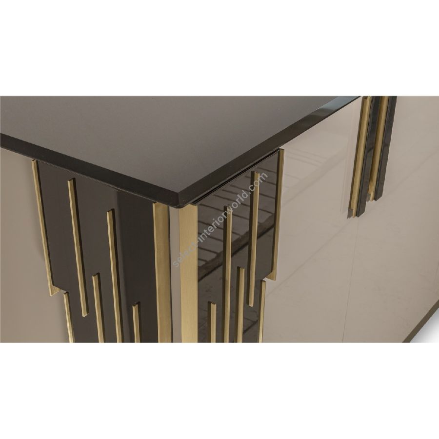 Buffet with wooden structure shiny lacquered finish. Top in lacquered glass and shaped decorations in shiny lacquered wood with details in glazed-gold metal. Plinth in brass finish. 4 doors with metal handles in glazed gold finish and glass detail.