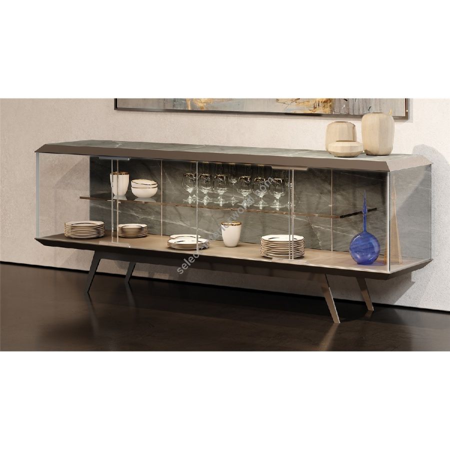 Buffet with bottom, top and legs in Bronze finish. Marble glass top cover. 4 hinged doors and Led strip under the top with light switch sensor under the base. Available in 2 versions: with structure in Supersilver glass with the 2 central doors and a section of the back with London engravings, very suitable as room divider, or with structure in extra-clear glass and back in MarmoReflex.