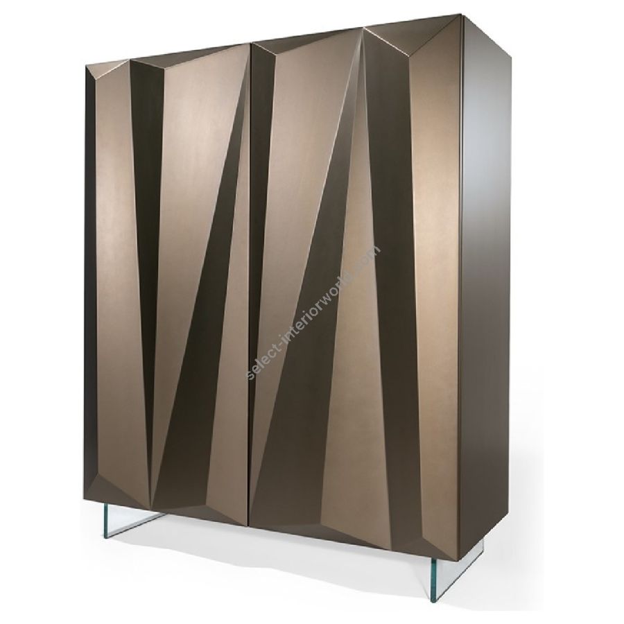 Wooden cupboard with 2 doors available in Canaletto walnut, matt lacquered or in satin brass or titanium finish. Glass shelves inside. Legs in transparent glass or in brass or titanium finished metal.