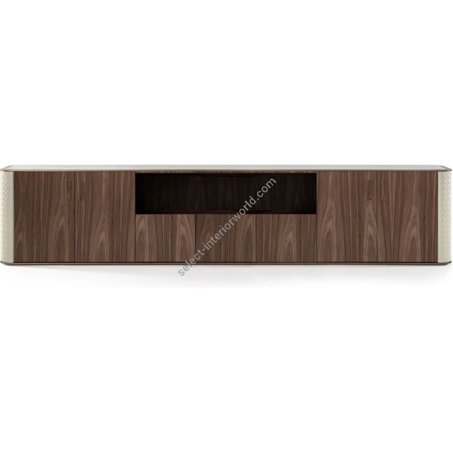 Buffet with wooden structure. Doors with push-pull opening. Sides covered with leather. Top in Marble glass with profile in satin brass finish. Intnal shelves in glass. 2 doors, 1 flap, 1 open space Sides in leather CAT.C, NABUK or COLORATA with quilting* Noce Canaletto, Canaletto Hennè, Rovere Beluga or shiny lacquered.