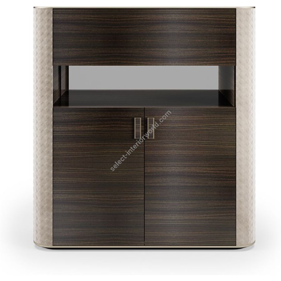 Cupboard with wooden structure. 2 doors with handles with wood detail, 1 flap with push-pulland 1 open space. Sides covered with leather. Top in Marble glass with profile in satin brass finish. Intenal shelves in glass. Sides in leather CAT.C, NABUK or COLORATA with quilting* Noce Canaletto, Canaletto Hennè, Rovere Beluga or shiny lacquered
