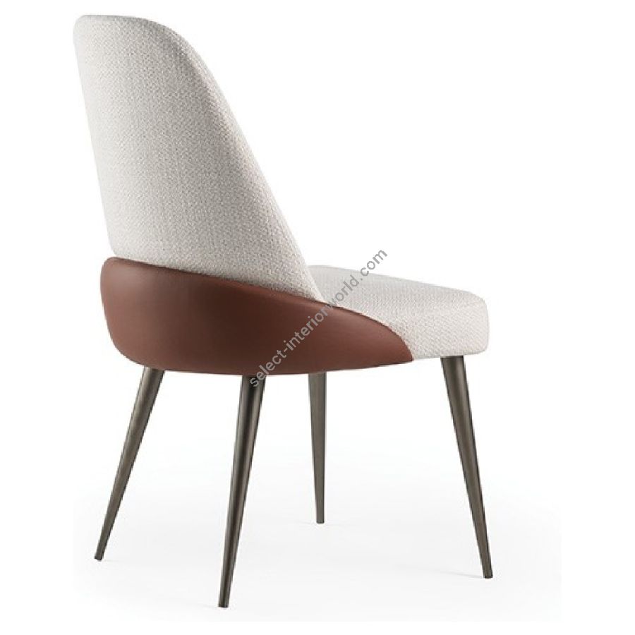 Chair with back and seat upholstered in leather or fabric. External cover in leather or fabric. Legs in bronze 100M, brass 104M, dark brass 105M, titanium 101M or in oakwood beluga and canaletto walnut.