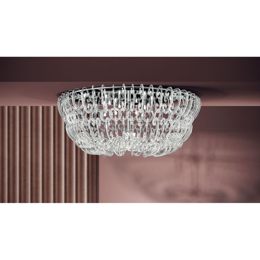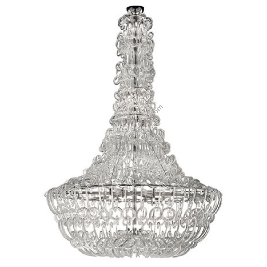 Chandelier with mirror glass support and shiny metal structure, decorated with transparent Murano glass curly elements. LED lighting system. Available in 3 standard shapes/sizes but can be customized for both shape and dimensions