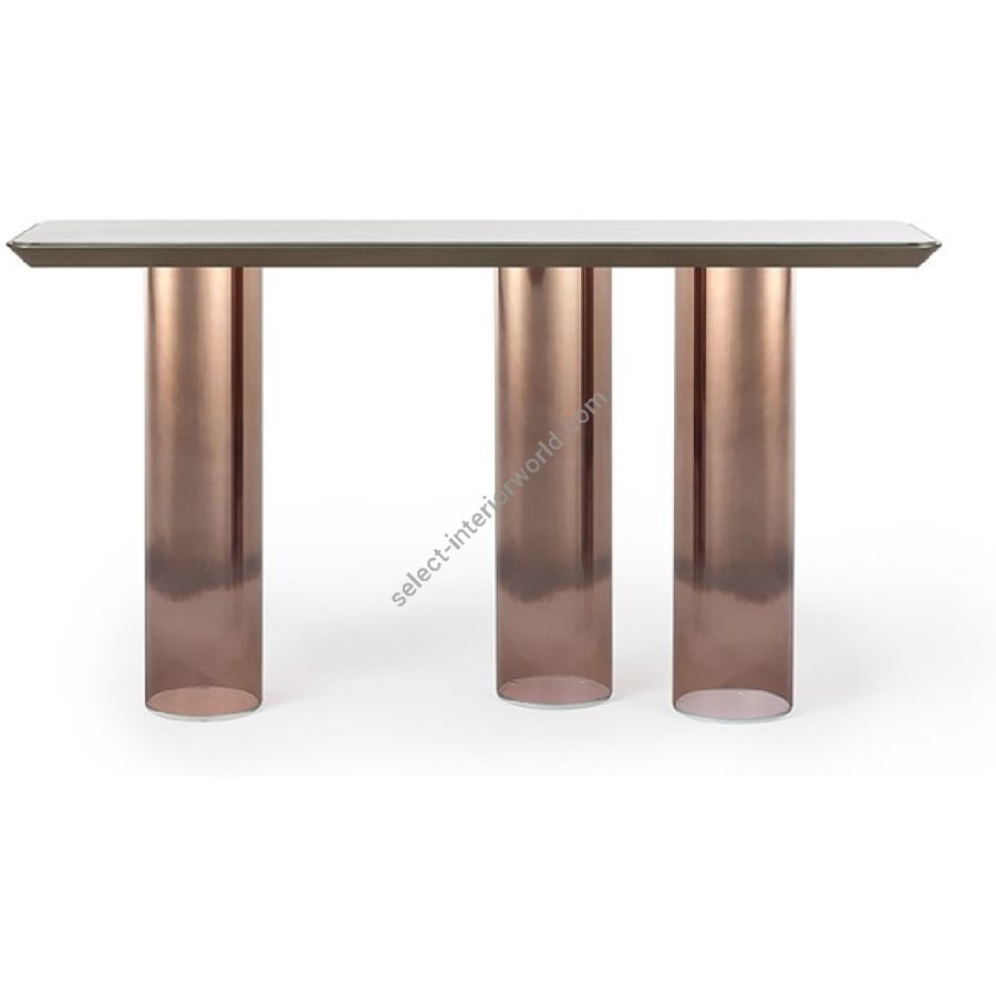 Console composed by 3 cylinders in borosilicate glass with shaded sputtering finish in Bronze, Silver or Copper . Glass top 12 mm thick with polished edges or in BevelWood 40 mm th. with edge in Bronze finish and MarmoReflex/Legnoreflex cover.