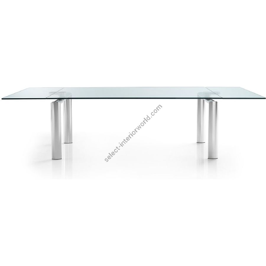 Extendable dining table. Top and extensions 15 mm thick in glass, extra-clear glass, Marmoreflex/Legnoreflex Legs: round section in brushed steel; oval section in bronze, satin brass, dark brass or titanium finish or in shiny chrome: curved glass 24 mm thick or 19mm thick extra-clear glass.