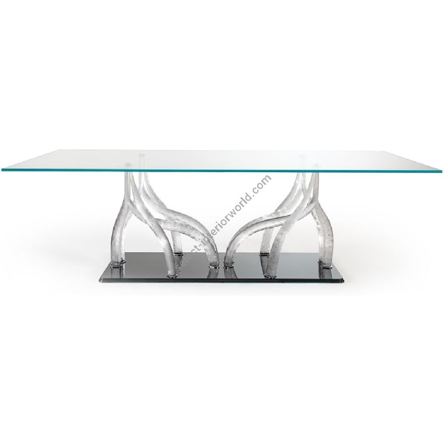 Dining table with base in transparent or gold Murano glass and plinth in black glass.Top in extra-clear glass 15 mm thick. Round version available as option with Diamante engravings and additional Lazy Susan top.