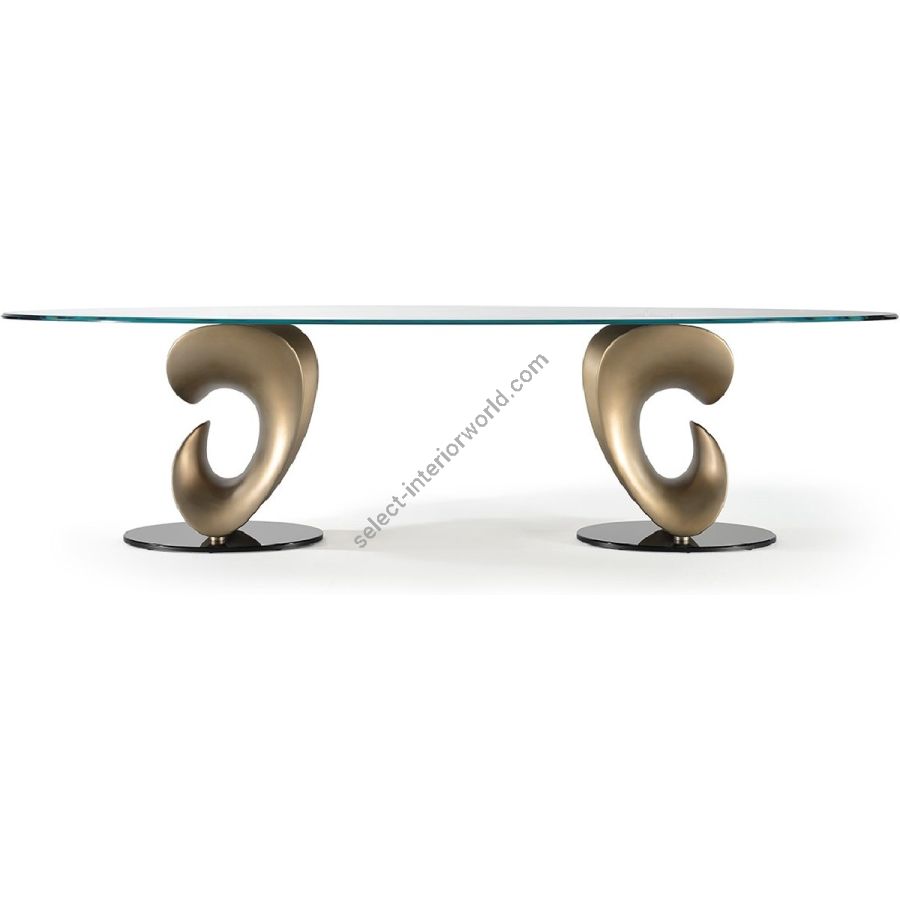 Dining table with bases in satin finish brass, dark brass, titanium and plinth in smoked mirror glass. Top in 15mm thick extraclear glass.