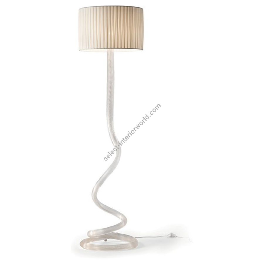 Floor lamp in transparent, black, amethyst, tea or gold ribbed Murano glass. Lampshade in ivory pongè fabric. LED bulb.
