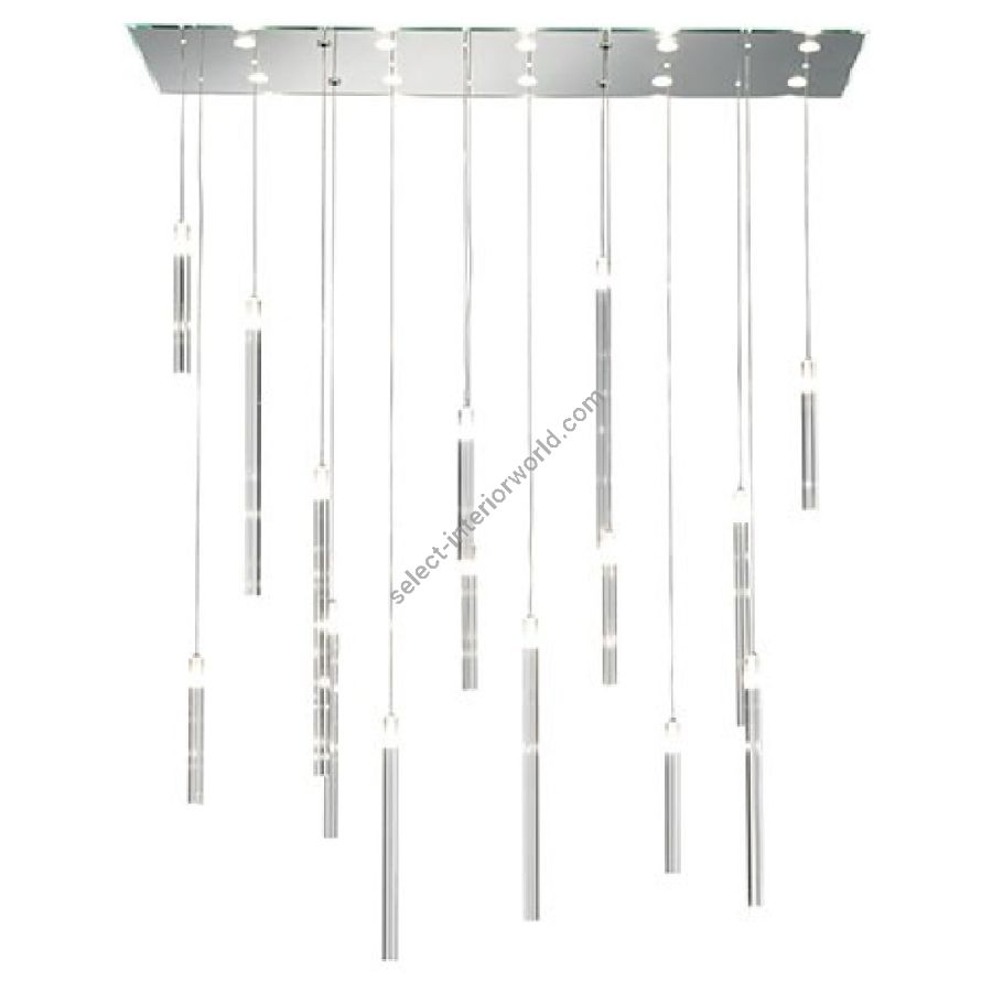 Lamp with ceiling plate in mirror glass with built-in LED and pendant elements in solid transparent glass with internal LED. It is possible to realize customized versions for dimensions, length and shape.