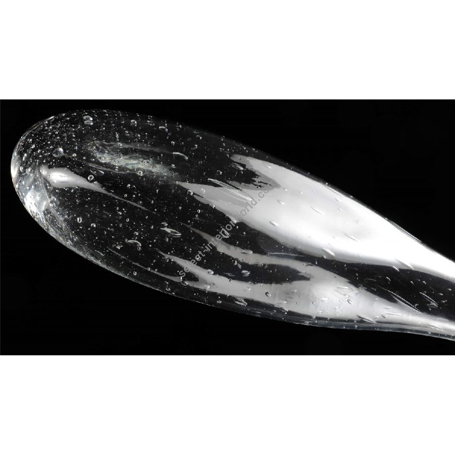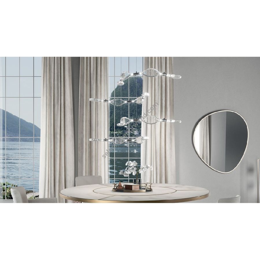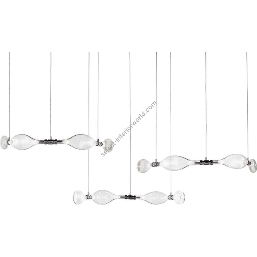 Suspension chandelier consisting of 3 modules (terminal, central, corner) to be combined together. The modules are in transparent blown glass with bubbles and with a chromed metal joint on which the LED bulbs and the electrified suspension cable are inserted.