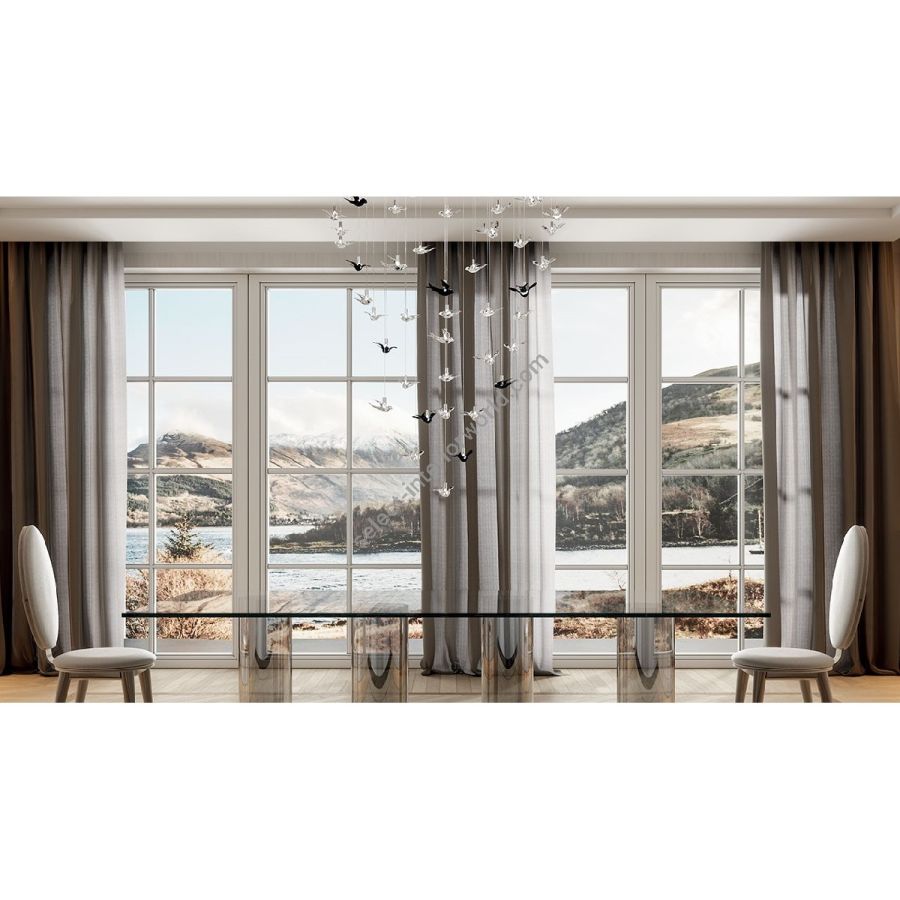 Chandelier with black, white or mirror glass support and pendant swallows in transparent and black Murano glass with internal Led. Available in various dimensions and shapes and can be customized for length and number of elements.