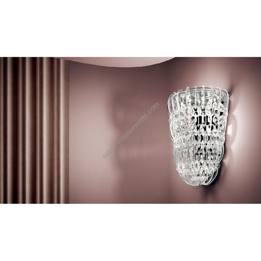 Wall lamp with shiny metallic structure and mirror back panel. Curly decorations in transparent Murano glass. Led lighting system.