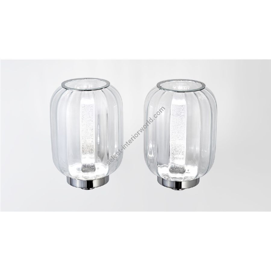 Wall lamp from the Lanterna collection. Made of artistic glass in the colors transparent, aquamarine, straw yellow. Internal glass diffuser with Rugiada finish and glass lid with magnet. Polished chromed metal support and LED light system.