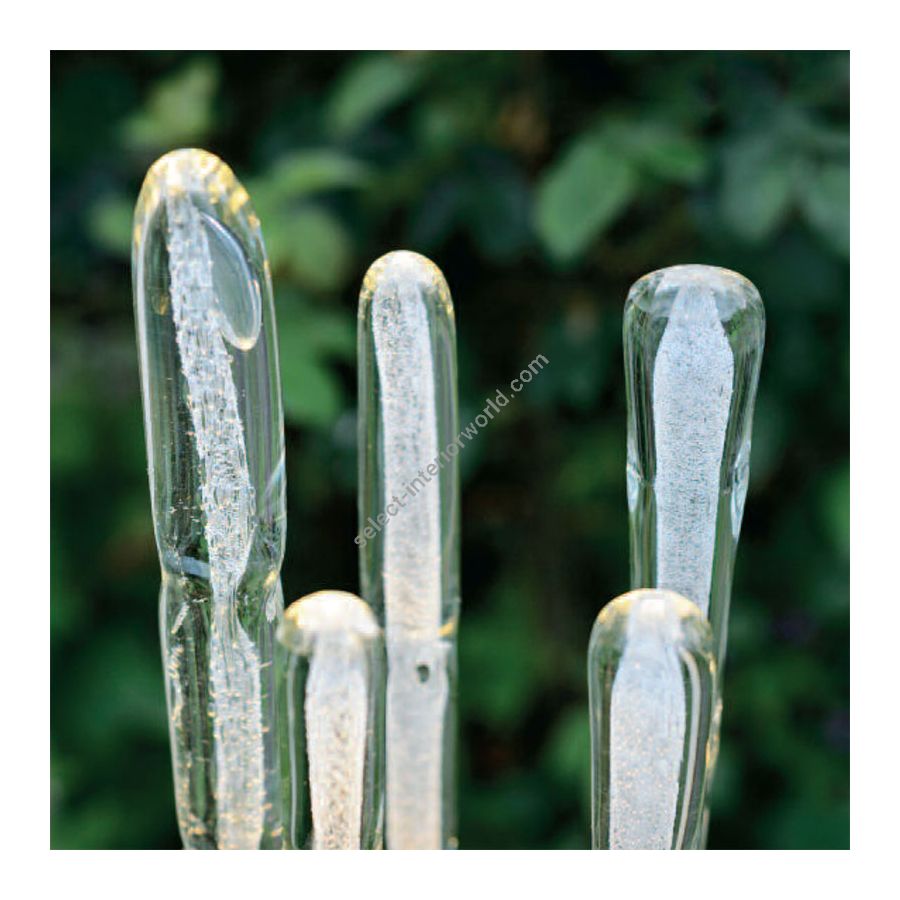 This Outdoor Glass sculpture lamp by Robers (Germany) is designed as a reed with the typical shape for the frames. Each of five stems includes LED bulbs attached with small holders to the round base. The whole lamp is made in a laconic design, as the main attention goes to the shades of blown glass. This reed post lamp is distinguished by the height, fully handcrafted of wrought iron for the base and the holders. It provides for sustainability and water-resistance to serve outside and become a true statement in your outer space.