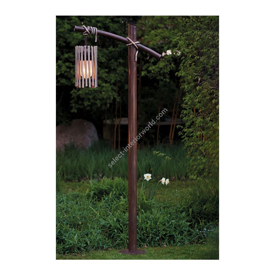 This elegant post lamp in the Industrial and classic style by Robers (Germany) becomes a perfect solution to enlighten the garden or the courtyard. It combines a laconic design at the base and the column with a refined ornate roof of regular round shape. Its shade of blown glass in an opal finish is framed by thin iron rods placed evenly around the lampshade.