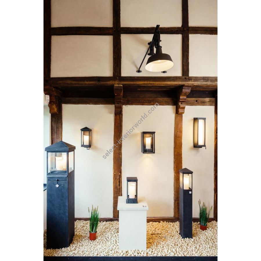 This outdoor wall lamp by German brand Robers has got an exceptional design where the main attention of the designers is attracted to its base. A small backplate is attached to the wall by the rivets. It holds a big rectangular arm with a spinning gear that is attached to the lampshade. There is an additional double support for the arm that serves more as a decoration, giving the whole fixture an uncommon look. Every detail and the lamp, in general, is made of wrought iron manually. It’s available in 10 finishes according to the customer’s requirements.