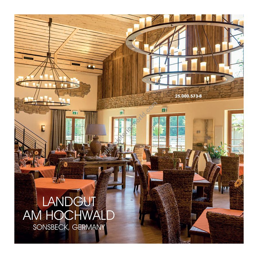 The suspension lamp belongs to the collection “Indoor 2” in the portfolio of the German brand Robers. It’s a version of the popular candle chandelier created in a more strict design reminding one of the lamps from Medieval times. A round base in a ring shape, as well as the tubes that connect it with the canopy, are all made of hard steel according to the brand’s tradition. The suspension lamp has two options for the type of lighting: 10 candles or 20 candles to shine brighter. Each candle has a cylindrical shape a-la the water lily bud, made of glass in an opal white matte finish. It provides for the warm light and, as a result, a cozy and elegant mood. Such a suspension lamp suits the rooms with a high ceiling in the private residence and restaurants, lobby of the hotels, or any other commercial project.