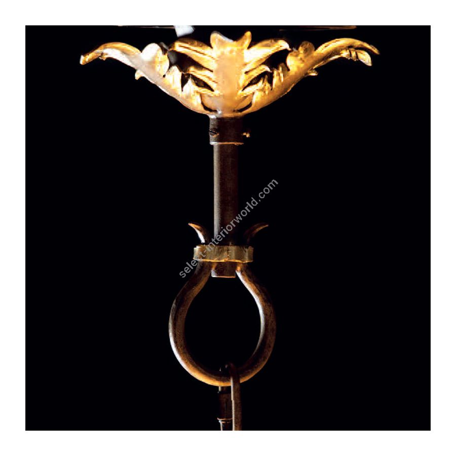 The new suspension lamp by Robers (Germany) is a combination of luxury and simplicity. The manufacturer prefers to keep its lamps rather simple, even laconic, but this time the designers created an amazing solution by adding some luxurious elements to it. The champagne color of the glass lampshades, the decorative elements - petals and leaves, the smooth and curved lines of the arms - all these details show how carefully the blacksmiths together with designers worked about this suspension lamp. Every single arm crowned with the lampshade is decorated by hand. The final lamp has got a classic bottom ball, the finials, and an elegant chain that connects the lamp through the loop with the top canopy.