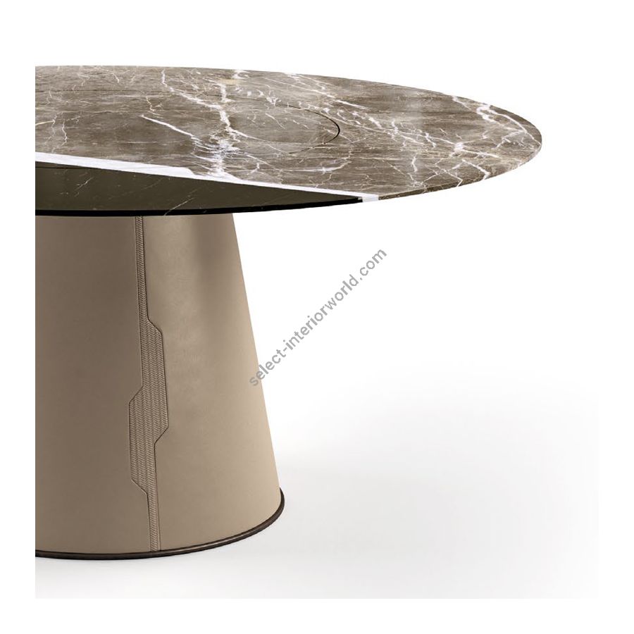 Dining table Duke with base in poplar plywood covered with smooth and printed leather (Thema 5005). Top available in marble (Grey Collemandina, Nero Marquinia and Volakas) or wooden lacquered MDF (Watersilk Smoked Eucalyptus). Also available the version of the top with integrated lazy susan.
