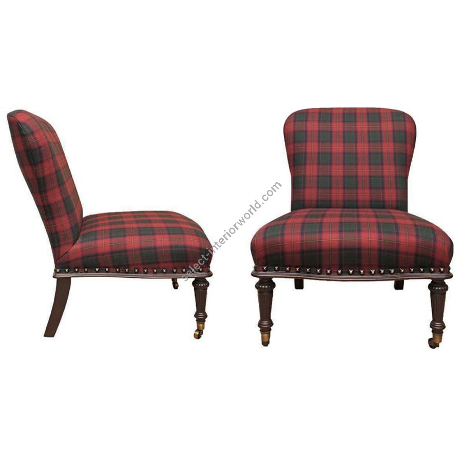 Couple of refined and comfortable Ralph Lauren Duke Premium Class chairs. These accent chairs create a great balance between classic elegance and modern chic. They are ideal for the bedroom, living room, dressing room or office. These chairs without armrests look presentable, solid and at the same time home-like. Stable frame of the chairs is made of long lived solid mahogany. Back has a curved silhouette that gives the chairs a special grace. The soft wool upholstery is easy to care for. It will tend to stay looking luxurious for a long term without compressing or wrinkling. You are sure to appreciate the quality in these fine checkered fabric. The seats of the chairs are edged at the bottom with exquisite décor, and elegant legs match him in style. Small casters are fastened to the bottom of chair legs to facilitate its movement across floors. Please note: The original chairs in this model from well-known American manufacturer Ralph Lauren are a rarity.