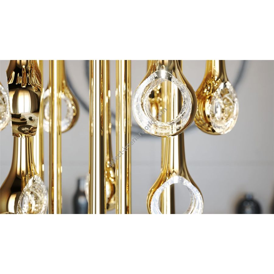 The Eyelet collection creates a striking visual with its sleek, elongated forms suspended from the ceiling, resembling polished needles. Each piece is enhanced with metal nanocoating, giving it a reflective finish, that captures and refracts light, adding an interplay of shimmer and depth.