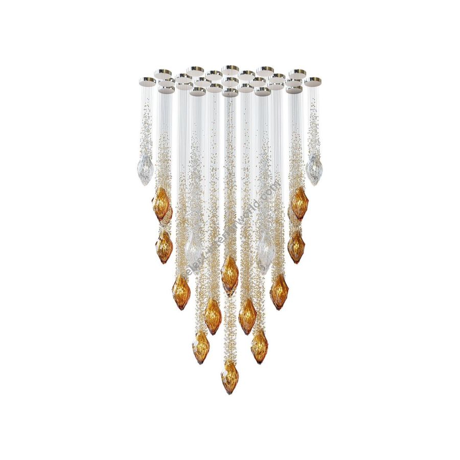 Capturing the beauty of a comet streaking through the night, the Flash collection features handblown crystal gems, each followed by a tail of glittering beads. Cascading downward, they create a bold installation that fills any interior with vibrant light and movement.