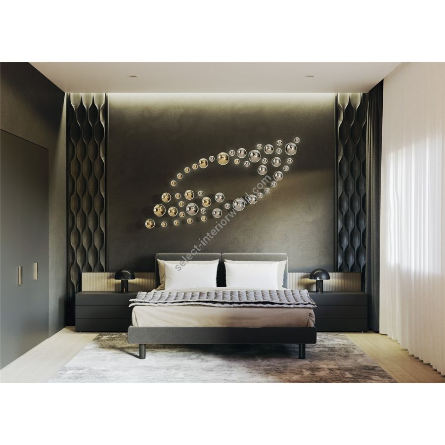Lagoon explore the soft free-form lines and curves of a beautiful lagoon. Just like in nature, create a private inlet with blue, gold, and titan nano-coated glass components that shine in every direction. Let your imagination play out the spectacular scenery right on the wall.