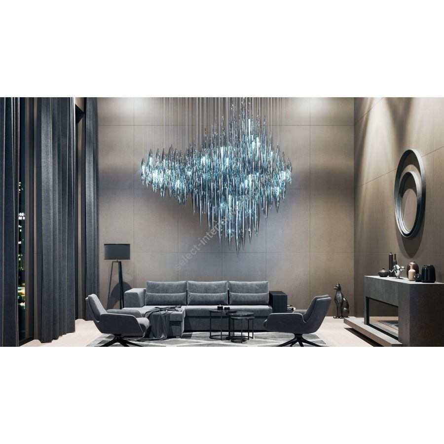 The Opera collection tells a story through light, with each element contributing to a composition as captivating as a grand performance. Handblown crystal pieces, suspended like the pipes of an organ, create a striking installation that brings drama and artistry to any space.