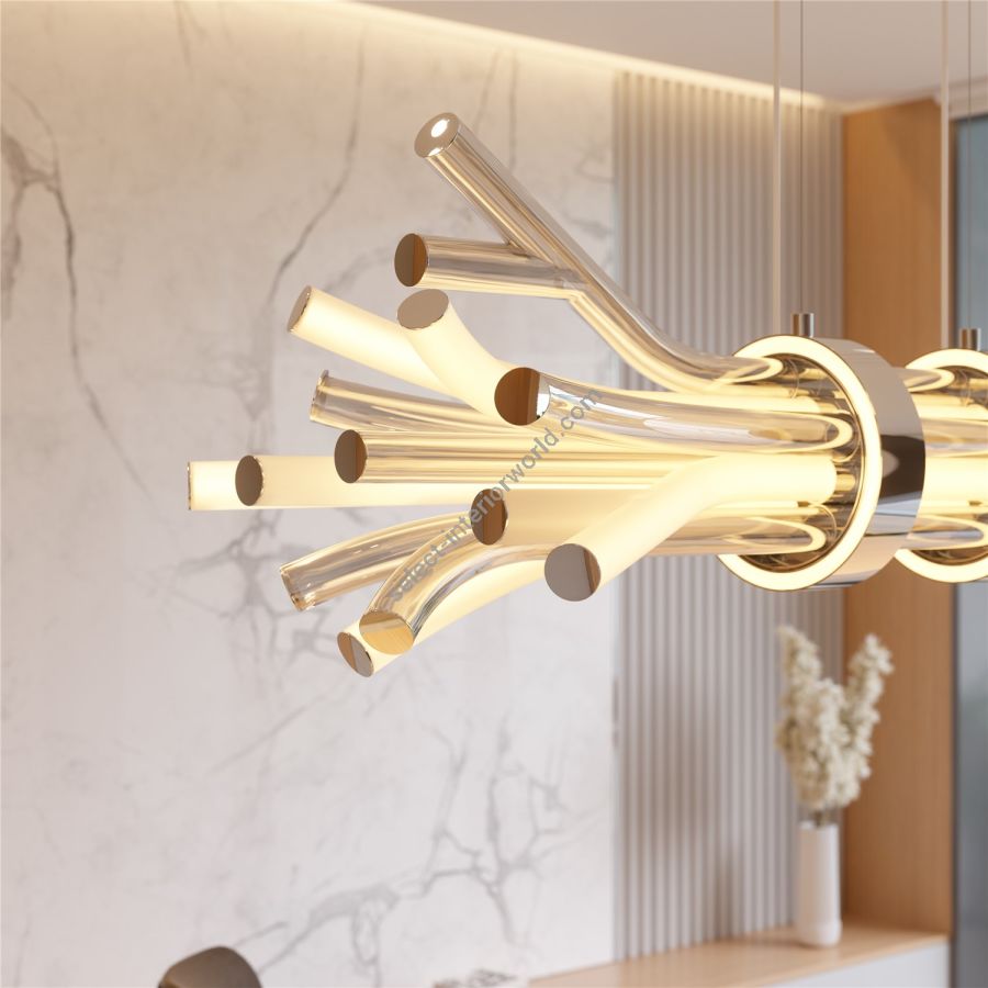 Branchy tells the story of the first lightning strike – the primal moment when fire met wood, igniting a light that endured even after night fell. This product line transforms raw, untamed energy into a refined interplay of crystal and metal, where nature and design converge. Sleek, elongated tubes stretch like branches reaching skyward, their polished surfaces catching and reflecting light. Soft, diffused glows emerge from sandblasted elements, evoking the gentle flicker of flames. A tribute to elemental forces, Branchy captures the delicate balance between destruction and creation, energy and elegance.