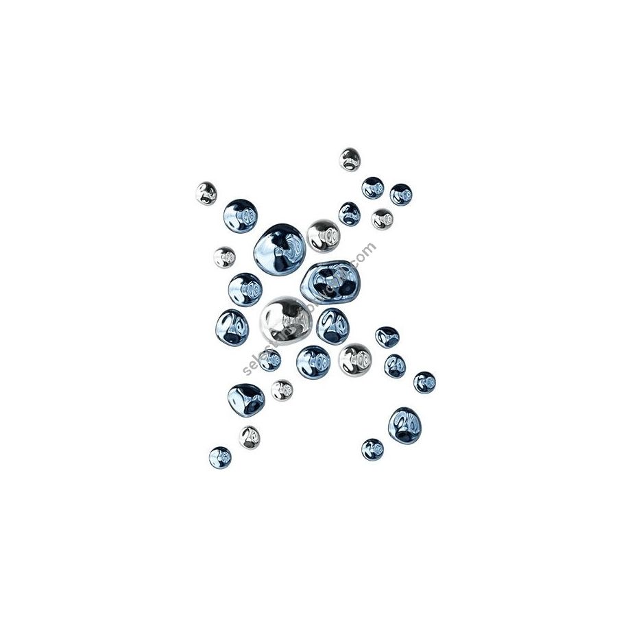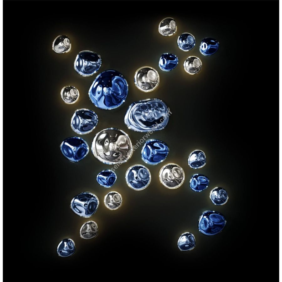 The Nuggets collection draws inspiration from raw, naturally formed lumps of gold and other precious metals found deep within the earth. Each crystal component is individually handblown and uniquely shaped, then finished with a reflective metal nanocoating. Every piece is one of a kind, allowing Nuggets to adorn any wall in captivating patterns.