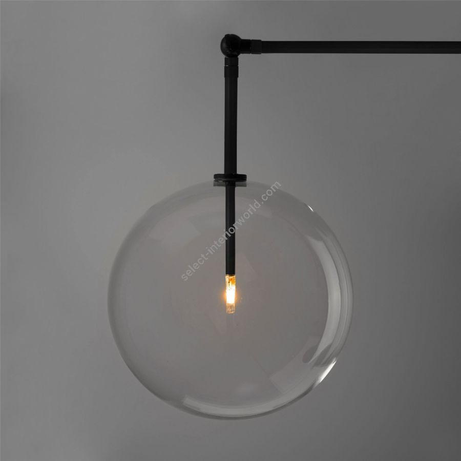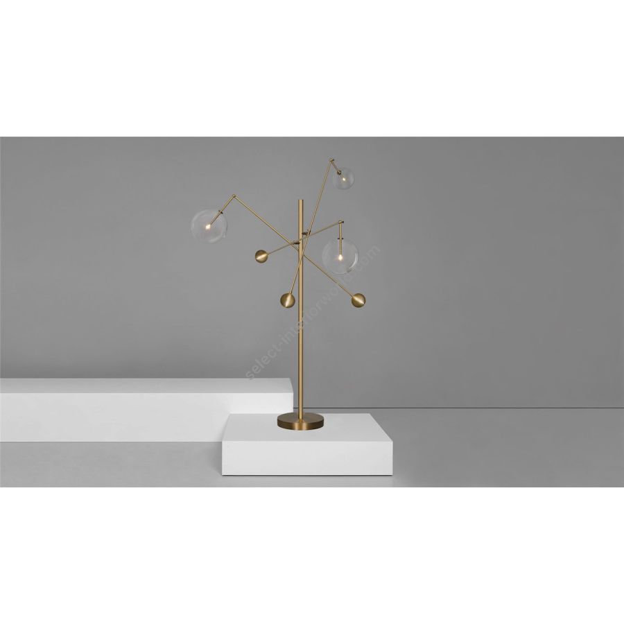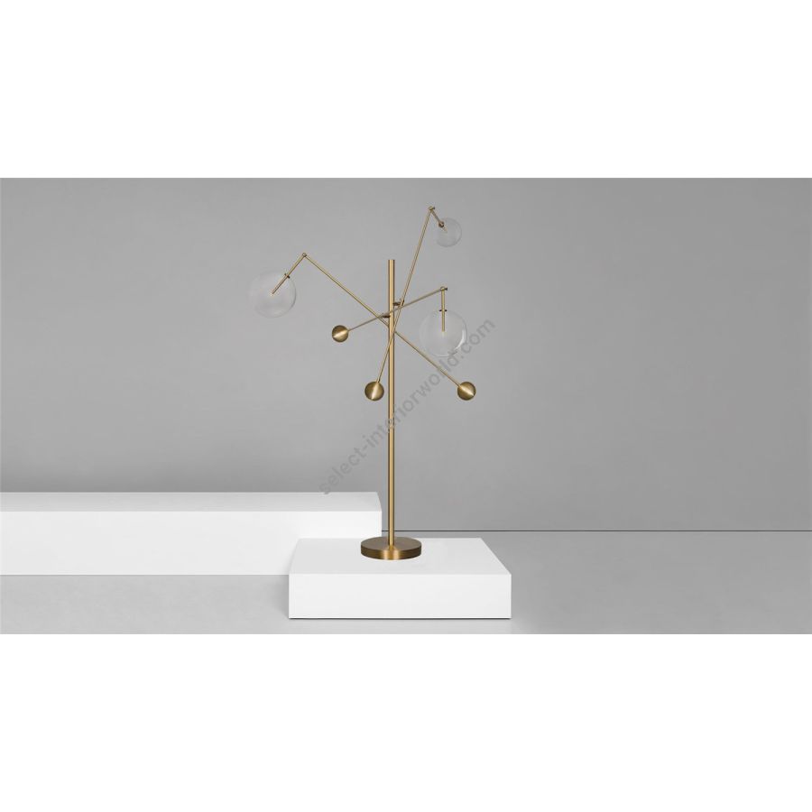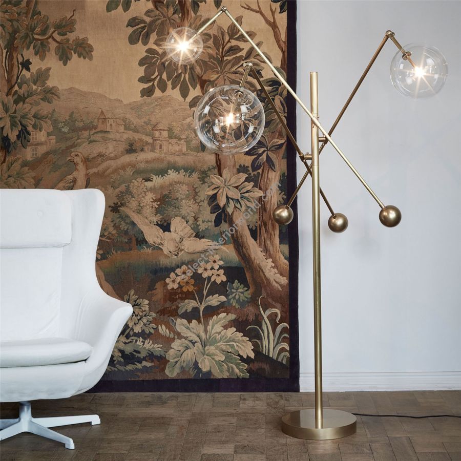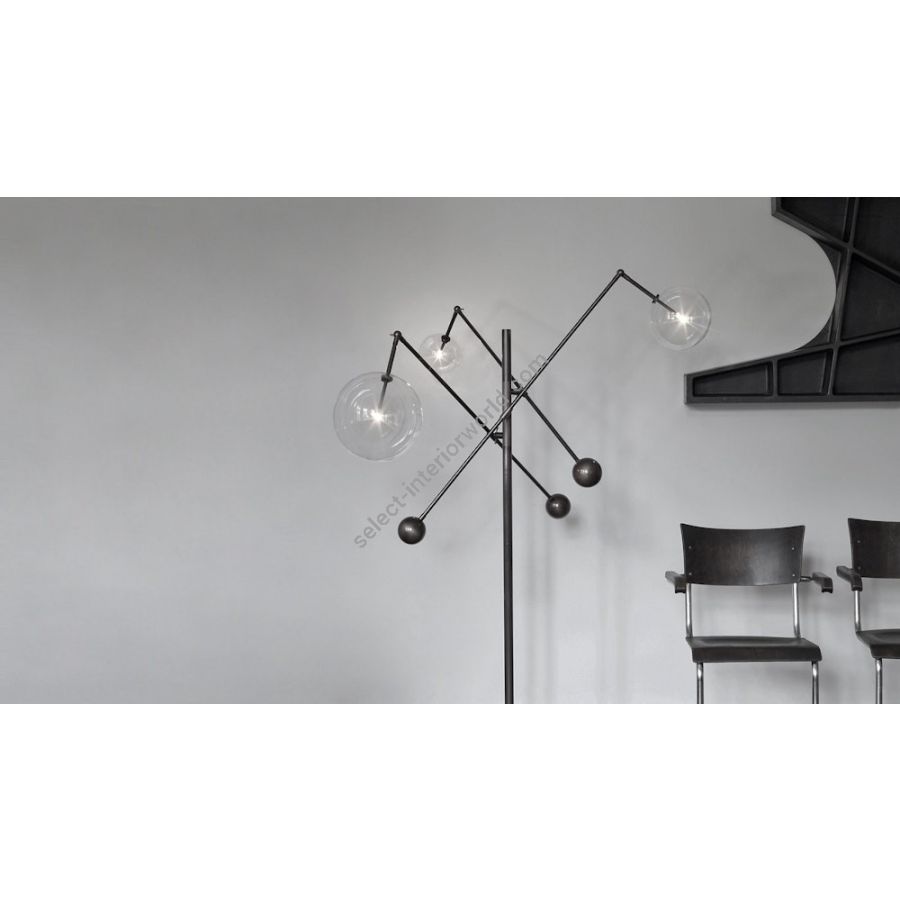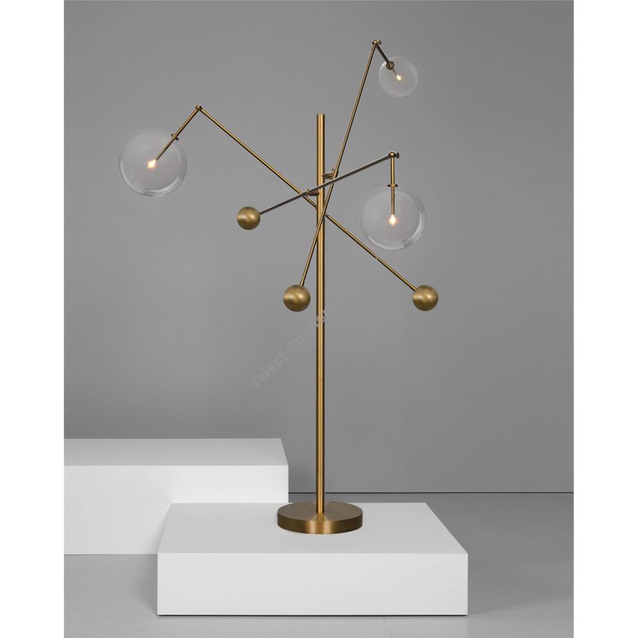 Three mouth-blown spheres upon cantilevered arms create an adjustable interplay of geometric angles. A free-standing lamp with a striking modular form, derived from the dynamic balance between illuminated glass globes and brass counterweights.