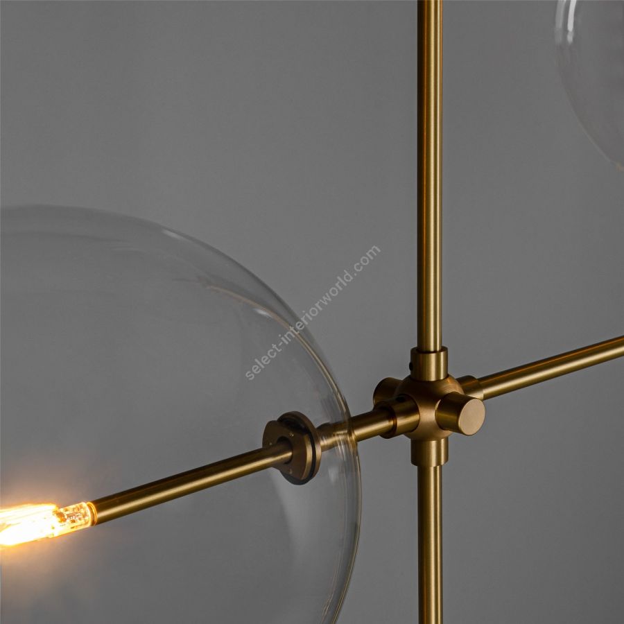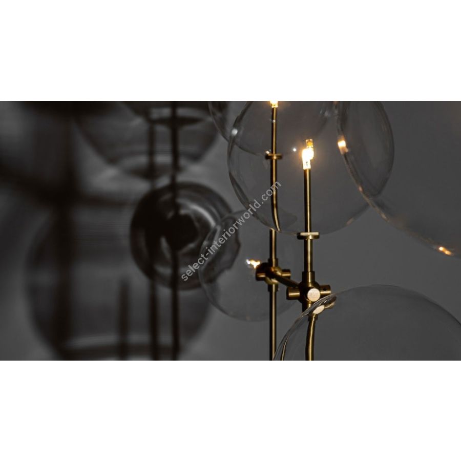 An array of ethereal glass globes floats weightlessly around a free-standing geometric lattice. The mouth-blown spheres are positioned rotationally around the right-angled brass grid, a spatial design creating an architectural impression.