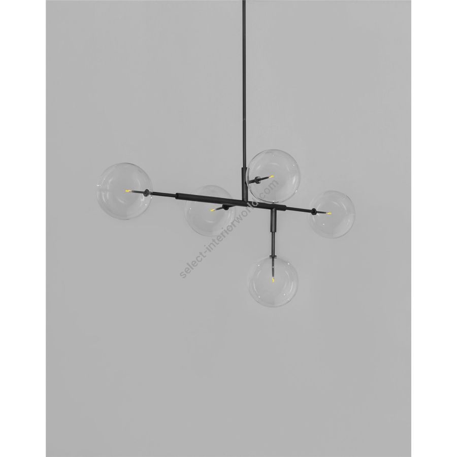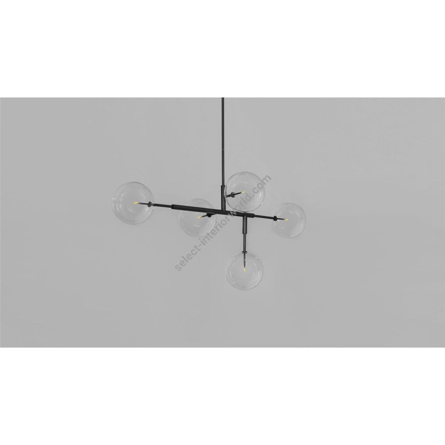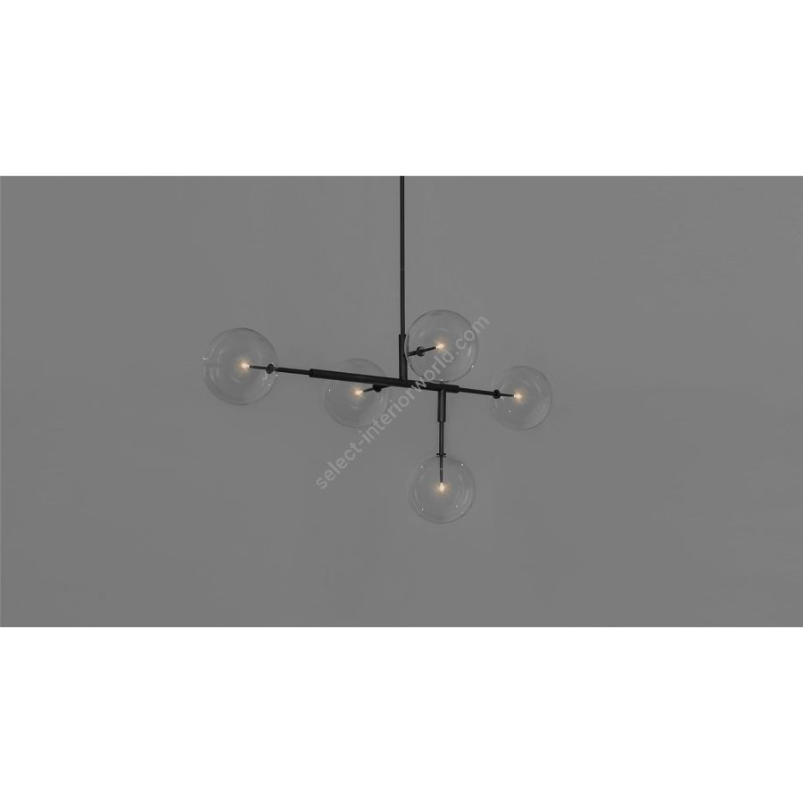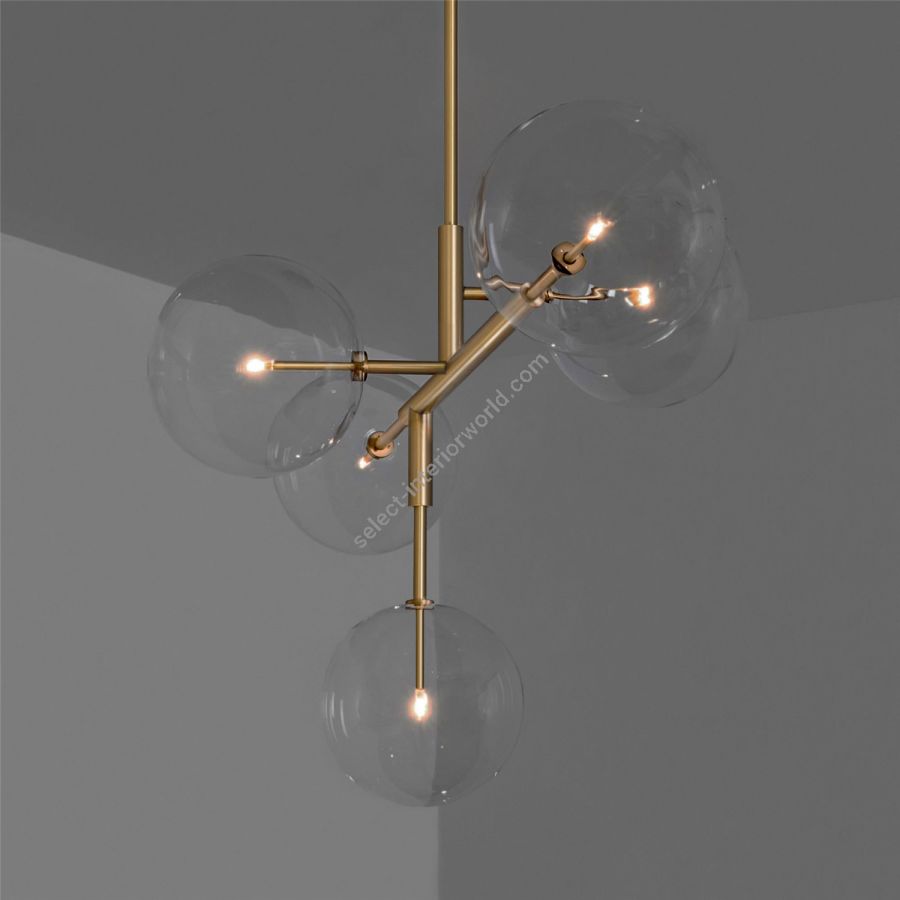 Five glass globes act as illuminated nodes upon a linear brass frame. A striking asymmetric geometry of clean right angles creates a contemporary fixture, a streamlined voyage.