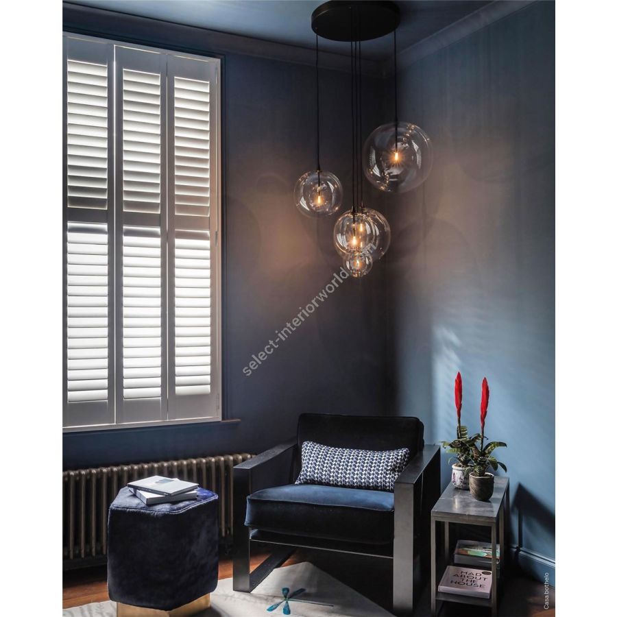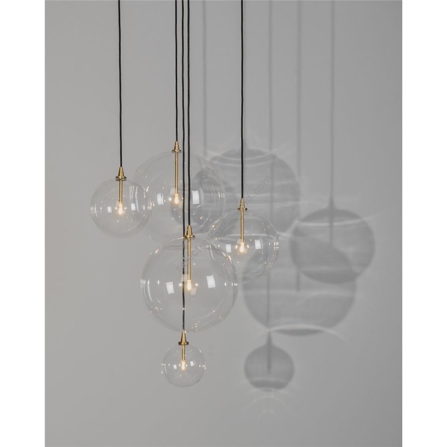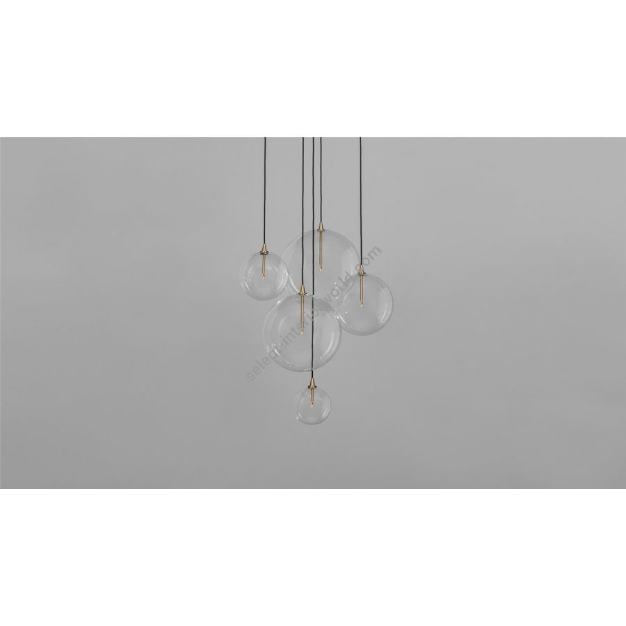 An arrangement of five glass globes suspended from a discus of brass forms a serene ceiling constellation. A range of diameters creates the impression of a flock of spontaneous soap bubbles, floating weightlessly in the air.