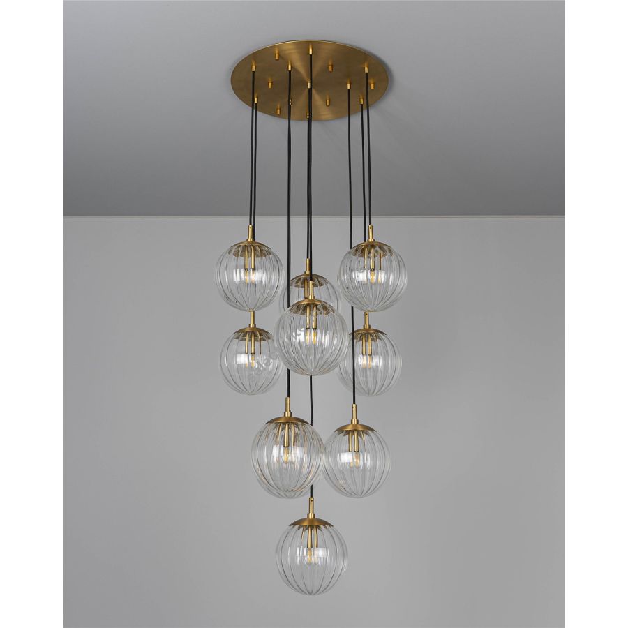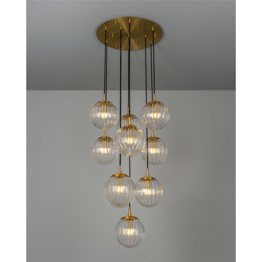 A cascade of ten glass spheres is suspended from a circular brass plate. Available in three types of signature glass, this effervescent vision hovers weightlessly like a cloud.