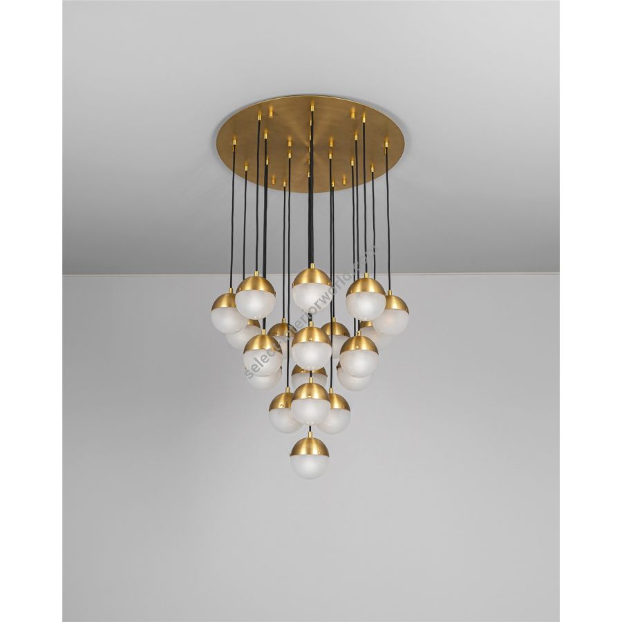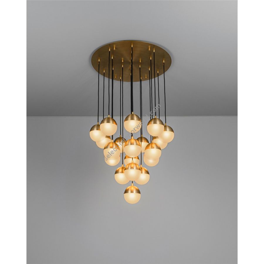 This hovering assemblage of radiating elements glimmers with vital energy. Inspired by elemental shapes, nineteen half globes emit an atmospheric light, anchored to a circular brass plate.