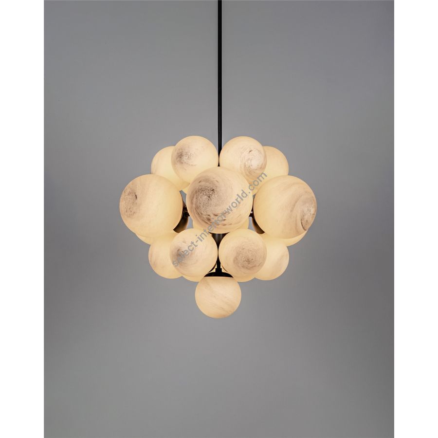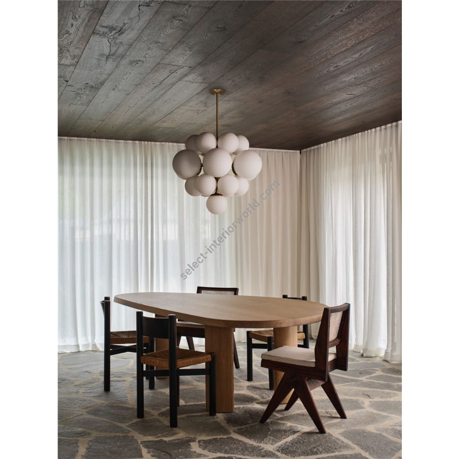 An effervescent cluster of glass spheres cumulates around a pendant brass frame. Majestic and modern, the composition invites a gestalt perspective shift when glimpsed from different angles: from side-on, a stellar cluster; from below, a single six-pointed star.