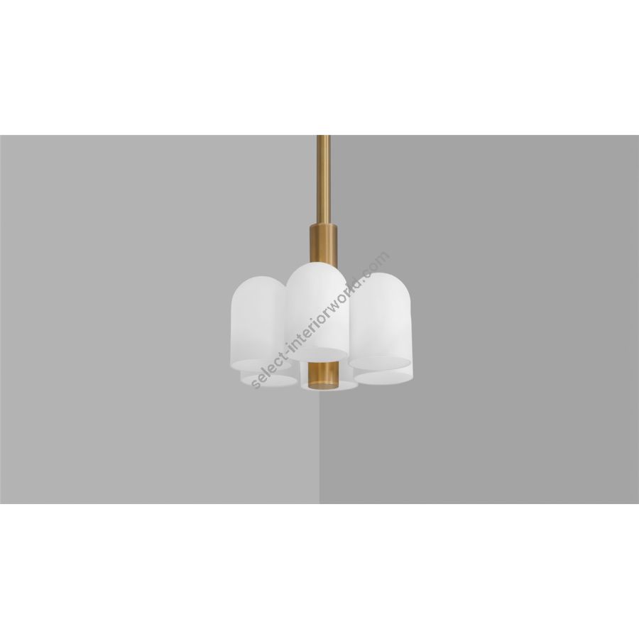 Influenced by the fashions of the future, in large and small scale. A honeycomb structure of six glass shades suggests stored energy. Gracefully suspended with a central brass shaft, the structure echoing its potential.