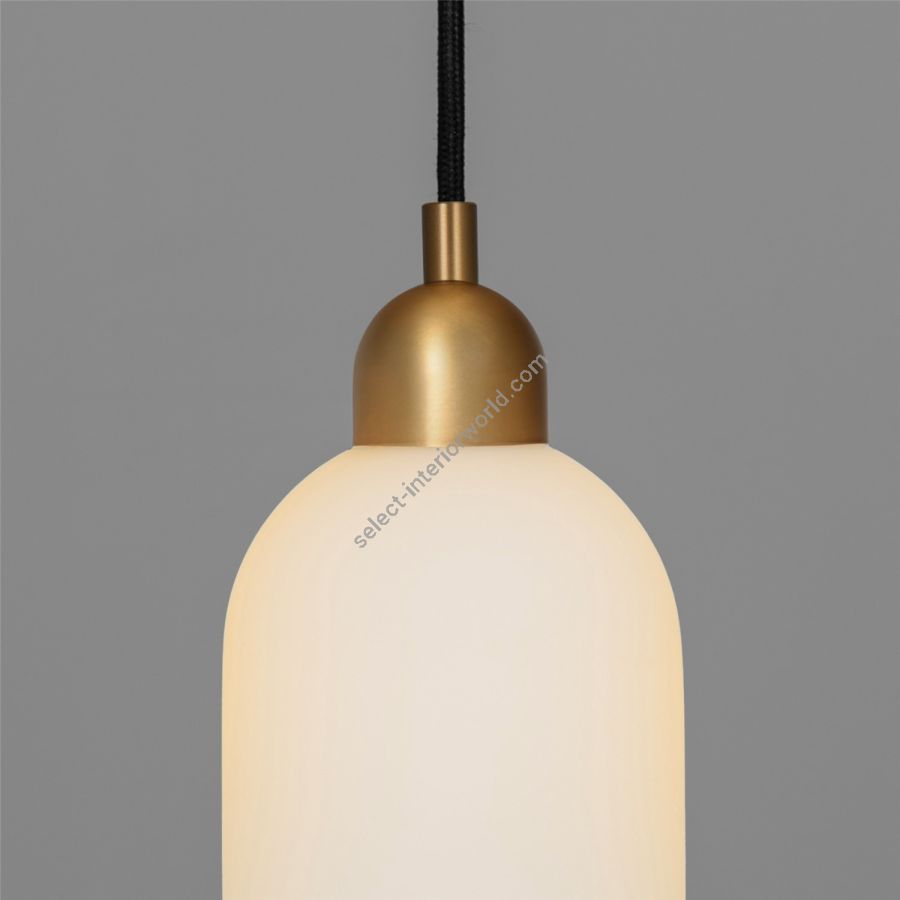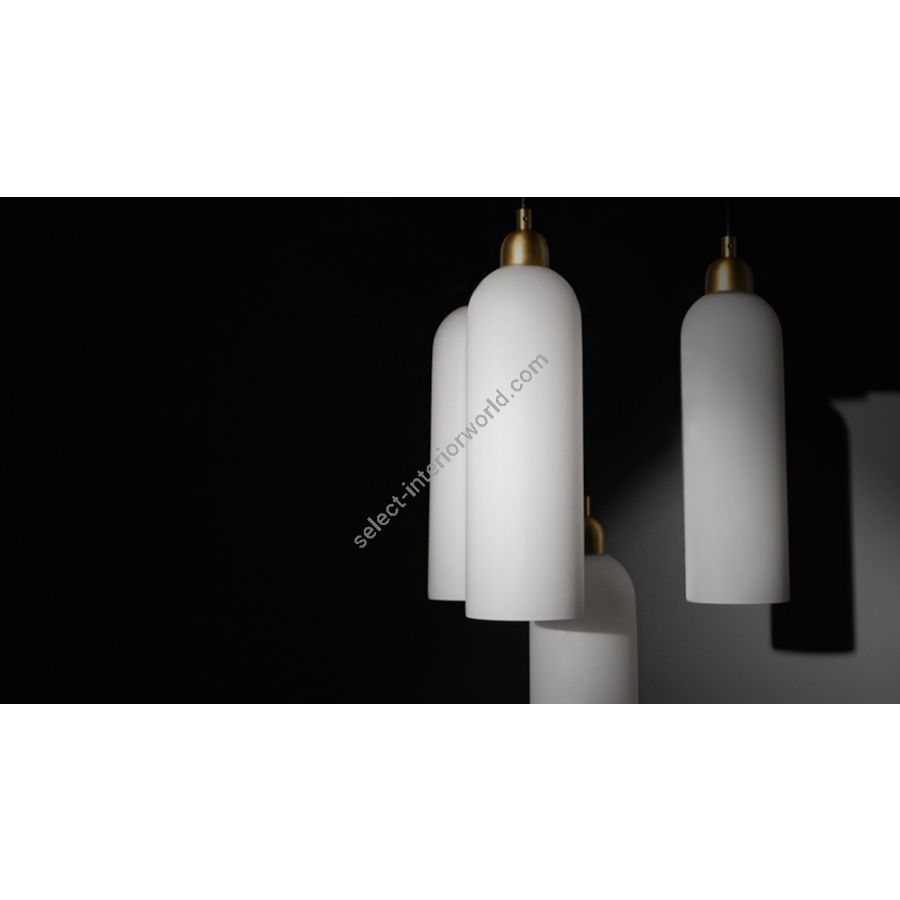 A gleaming constellation of nine opal glass arches strike the eye with their sleek arrangement and brass accents. This design is a study in rhythm, the repeated forms make a melodious choir transporting us with their glowing voices.