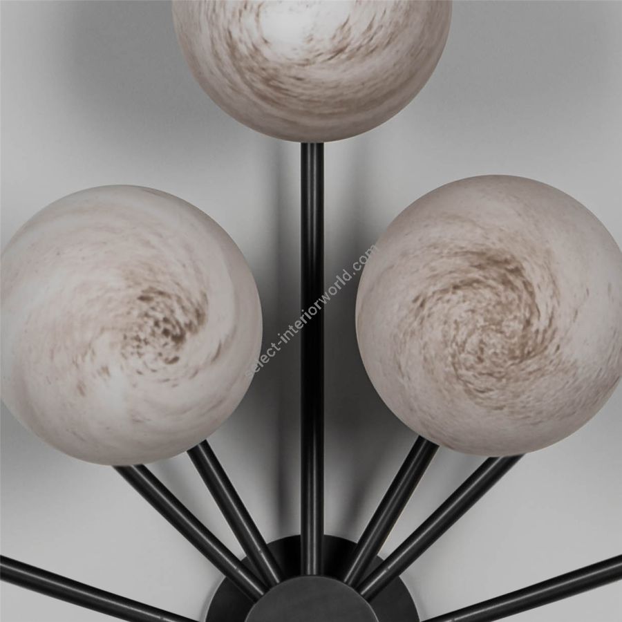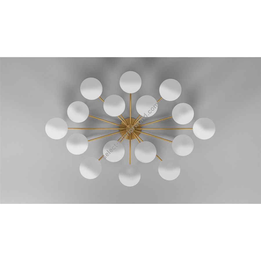 This oval arrangement of lights explodes into a brass and glass sunburst, spreading across the ceiling. A constellation of illuminated globes linked to a central axis creates a space-defining sculptural impression. The flush mount base gives this majestic chandelier special adaptability.
