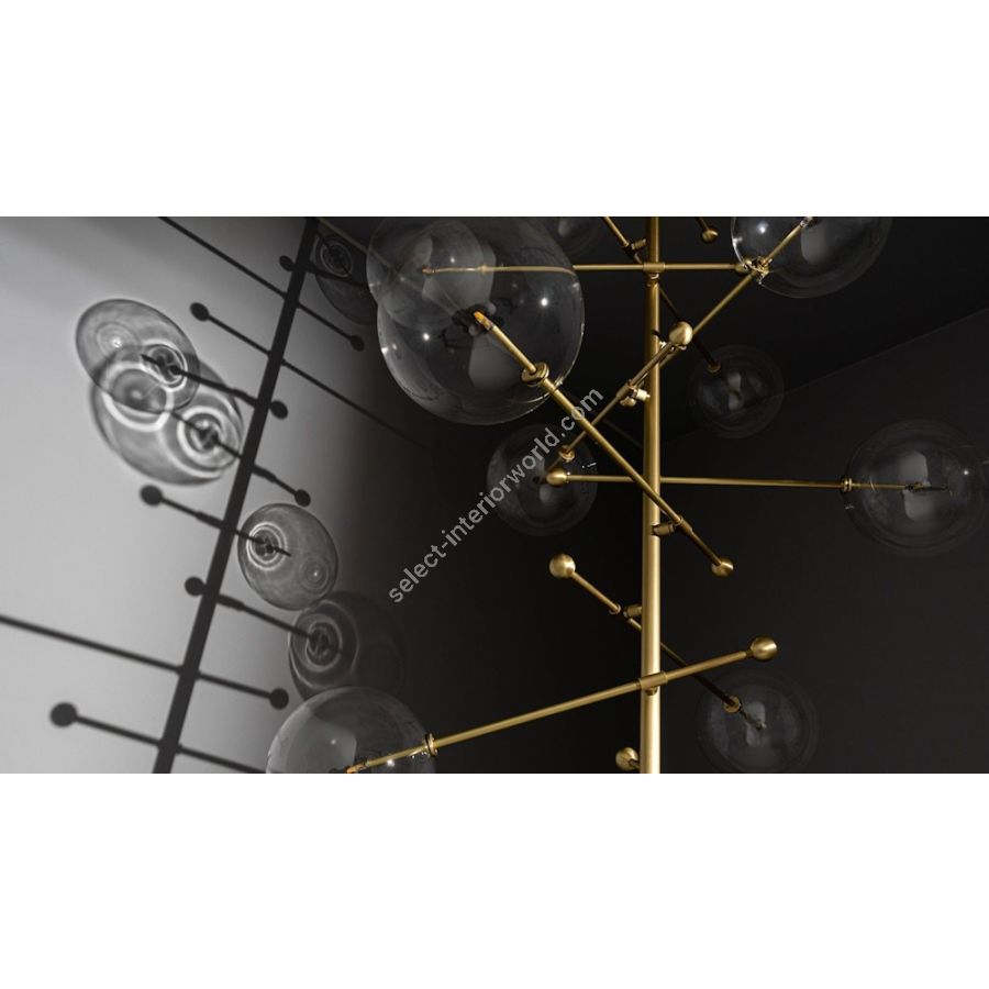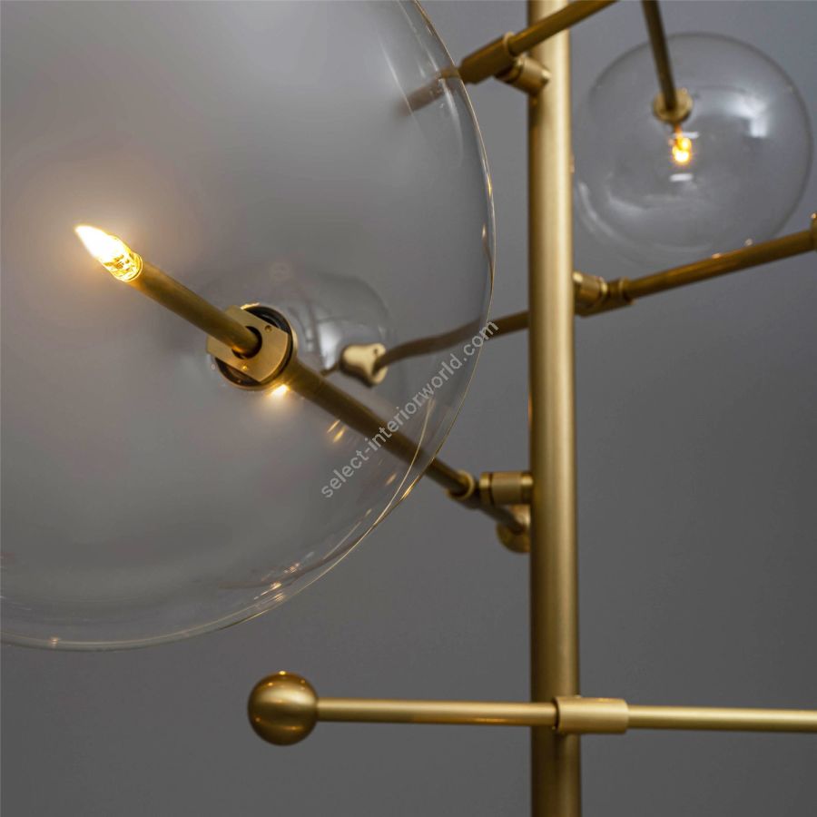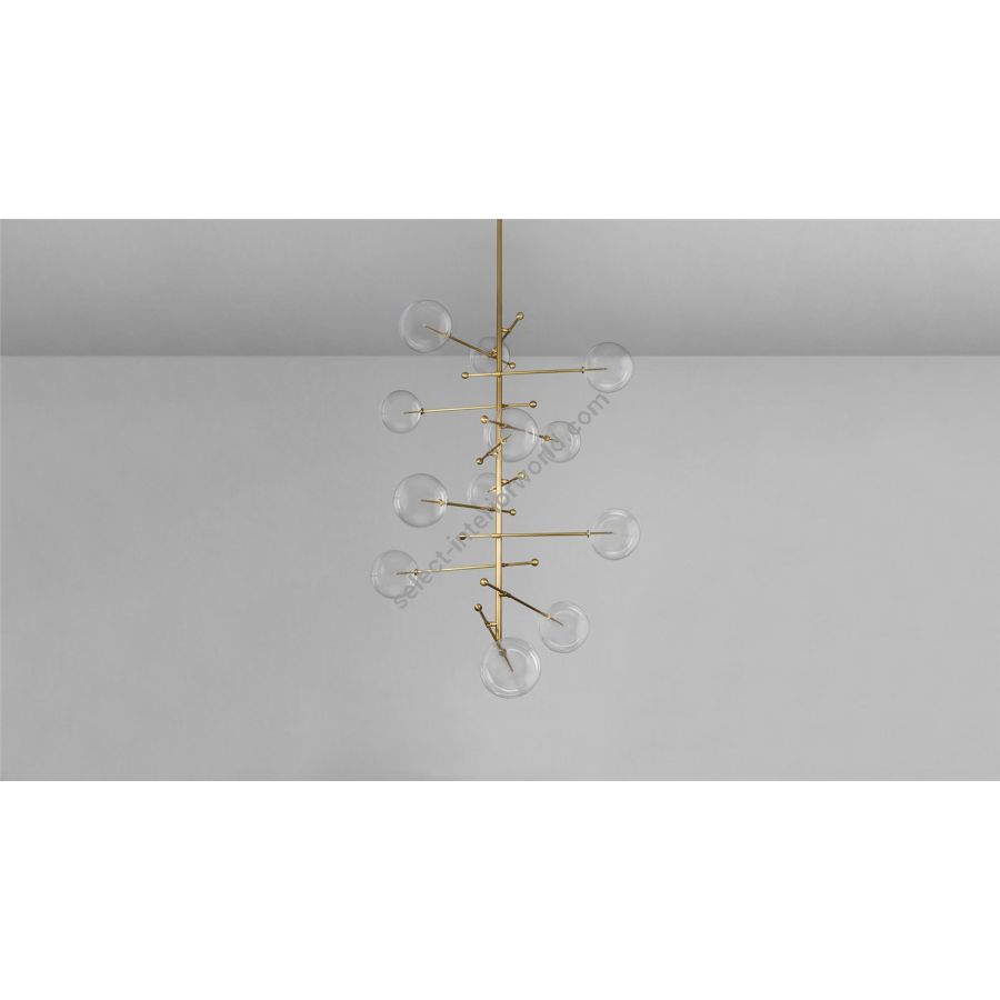 A duodecet of mouth-blown glass globes orbit a central axis, balanced on cantilevered brass arms. The poised asymmetry of the intersecting angles forms a gyroscopic composition, bringing an interstellar elegance to a space.