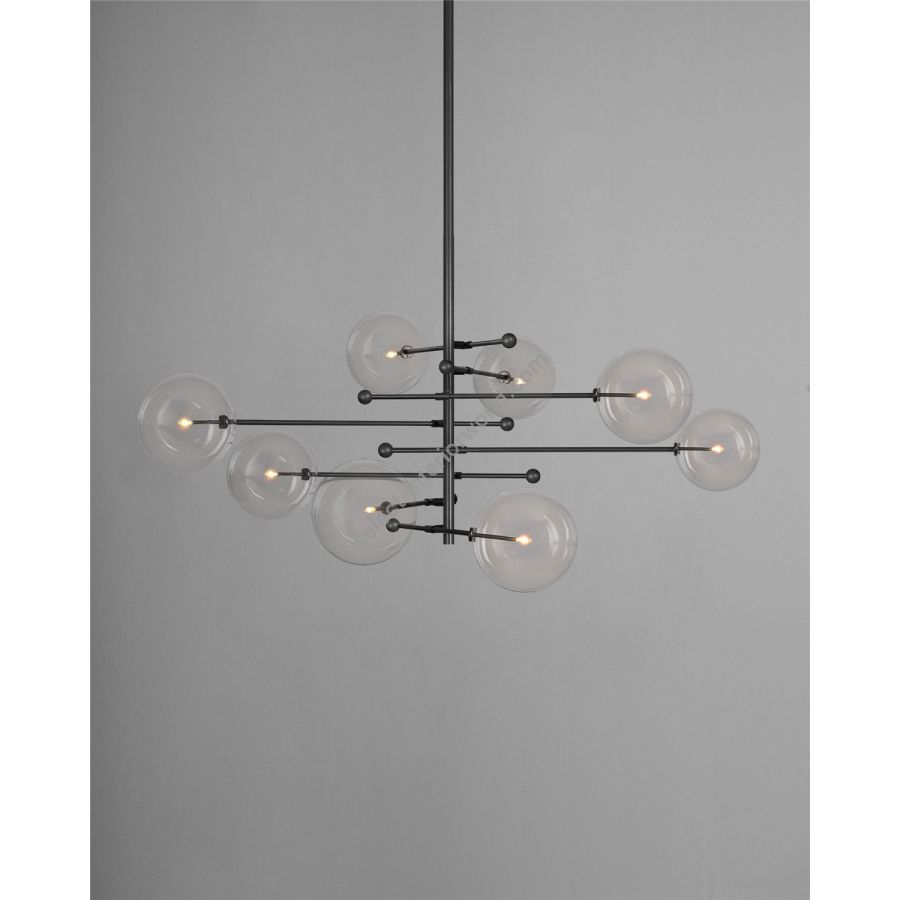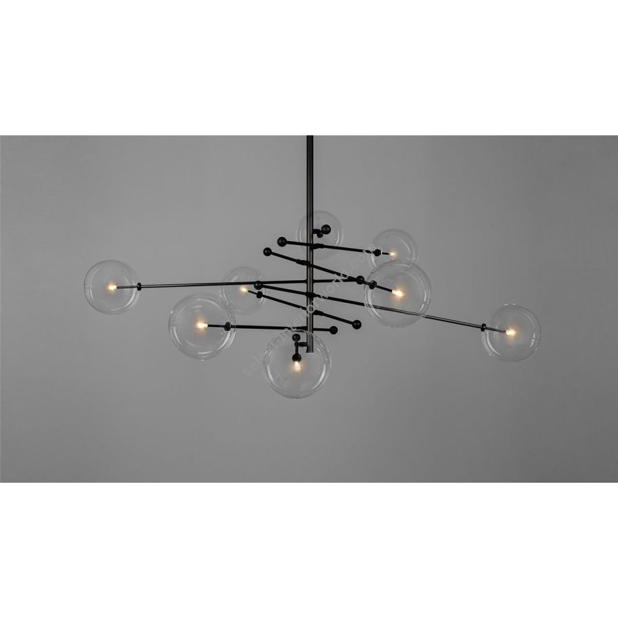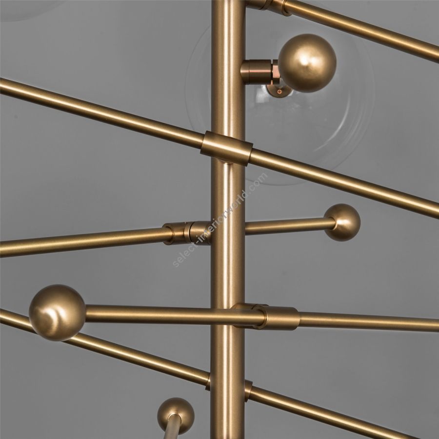 An octet of mouth-blown glass globes orbit a central axis, poised on adjustable cantilevered brass arms. The modular asymmetry of the intersecting angles forms a gyroscopic composition, bringing an interstellar elegance to a space.