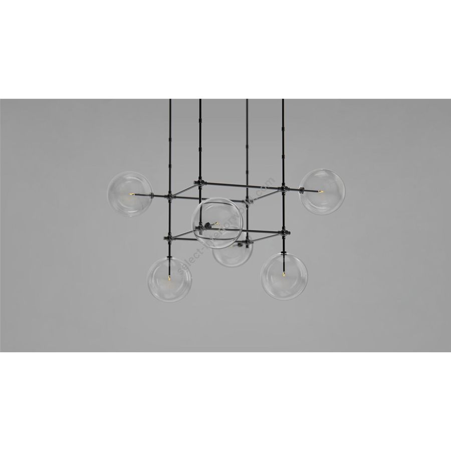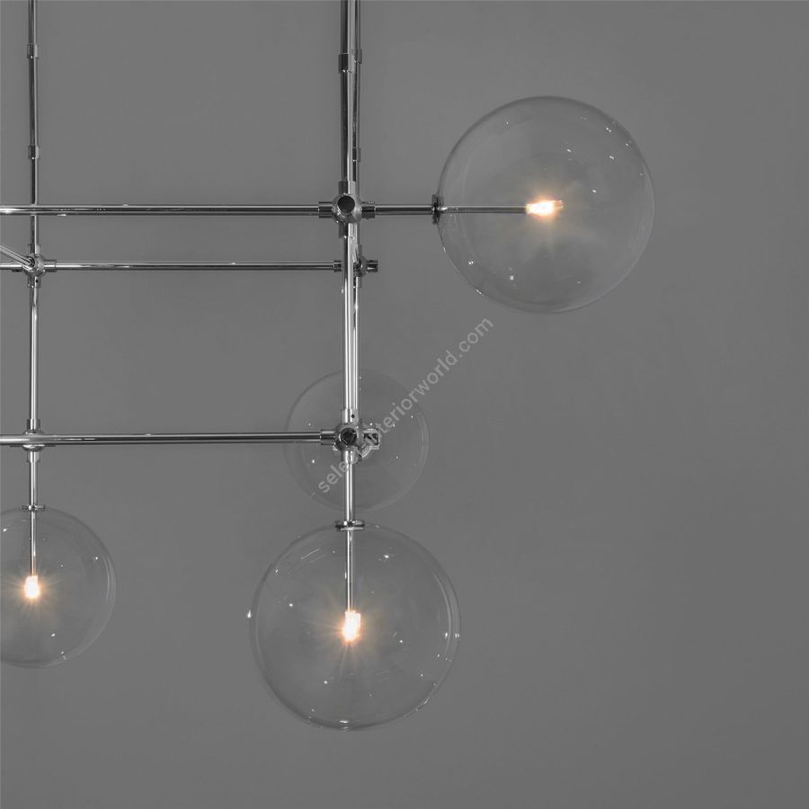An array of ethereal glass globes floats weightlessly around a right-angled geometric lattice. The mouth-blown spheres are positioned rotationally around the brass grid, a spatial design creating an architectural impression.
