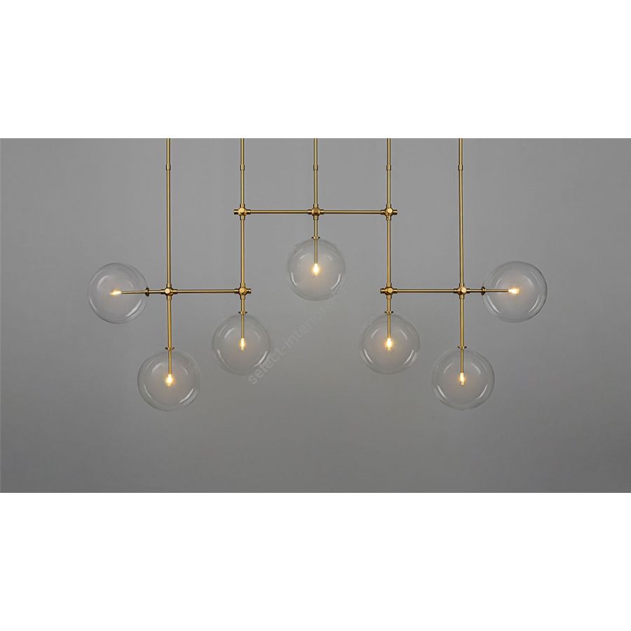 An array of ethereal glass globes floats weightlessly around a geometric lattice. The linear symmetry of the brass grid creates a covalent frame for the sparkling mouth-blown spheres.