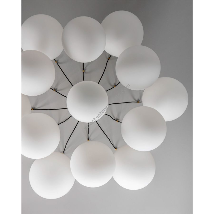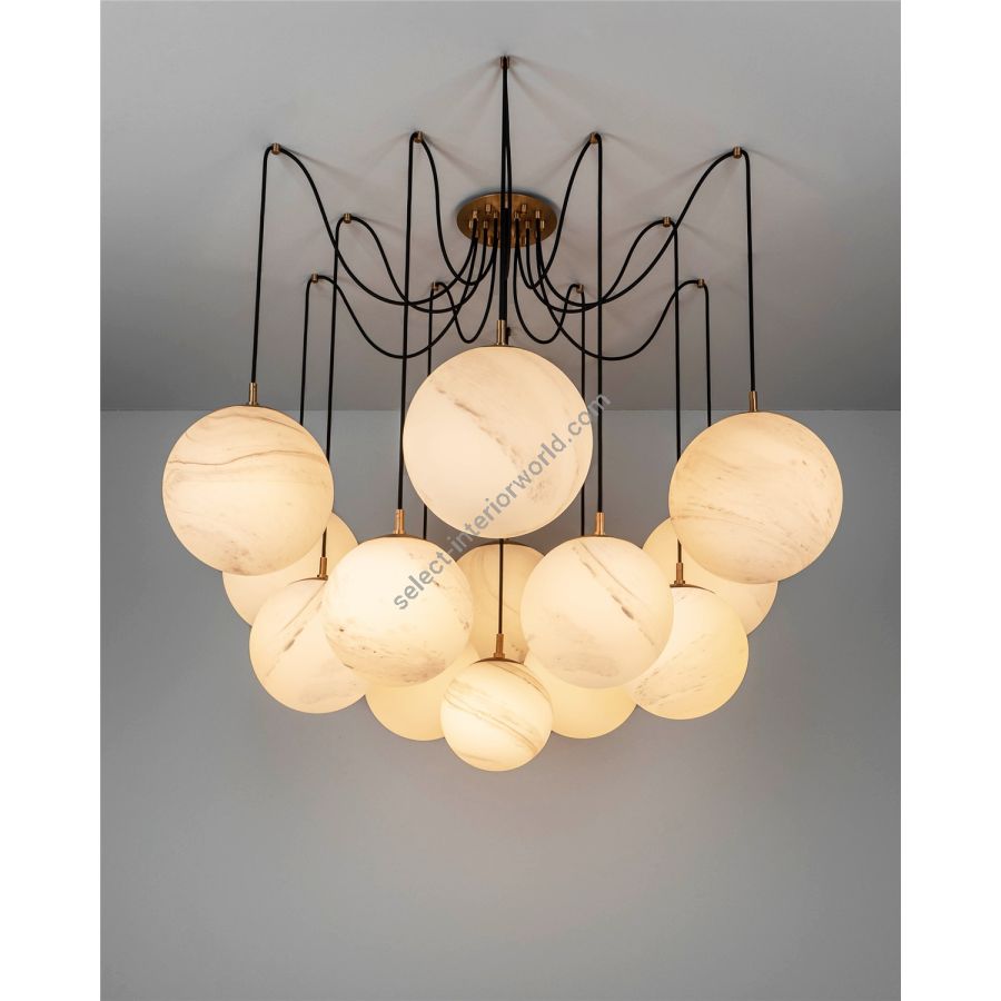 An array of thirteen globes hangs in dramatic suspension. The spectacular drape of the dark cables creates a gravity-defying web, nursery to a cascade of bright orbs. The form pays tribute to the uncanny beauty of the arachnid, evoking the iconic sculptures of Louise Bourgeois.